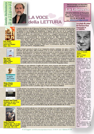 - La rubrique des nouveautés littéraires de Louis Salvatore Bellanti ainsi que les ouvrages “Fogoler, storia di una famiglia istriana” di Grazia Del Treppo ou “Storia di una famiglia imperfetta” a cura di Marie-Christine Scapol Valery-Radot ou “Réflexions éparses sur l’Italie politique contemporaine” de Julien Giudicelli.